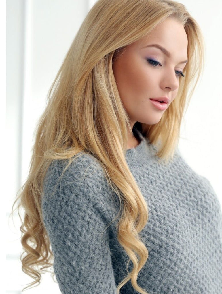 A gorgeous golden honey blonde shade that complements nearly every skin tone. Our weft/weave in hair extensions are made with premium remy human hair.