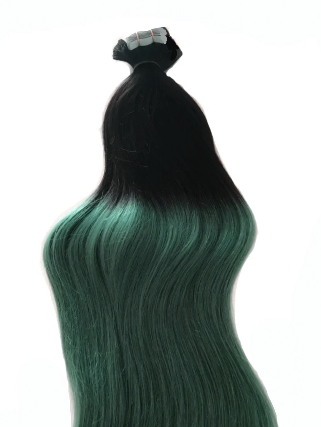 The "Tropicana" shade offers a bold blend of dark brown roots that seamlessly transition into a vibrant teal-green balayage ombre. These tape-in extensions create a striking, tropical-inspired look with rich, deep color and a playful twist. Perfect for those seeking a unique and captivating style with a smooth, flawless finish.